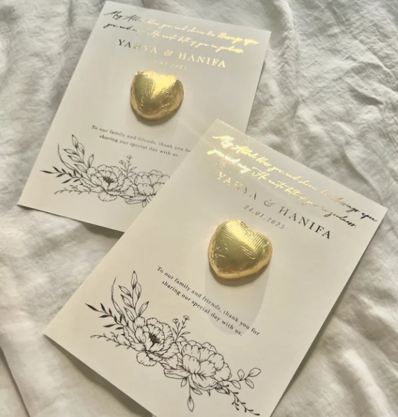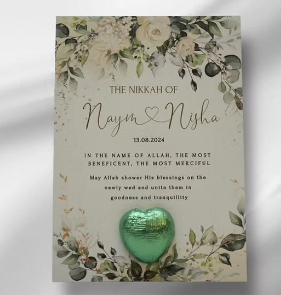 Personalized with the couple’s names, Nikkah date, or a meaningful dua, each favor card carries a message of love, faith, and gratitude. Crafted with premium-quality materials and delicate finishing, they add a soulful touch to the favors shared with family and friends.